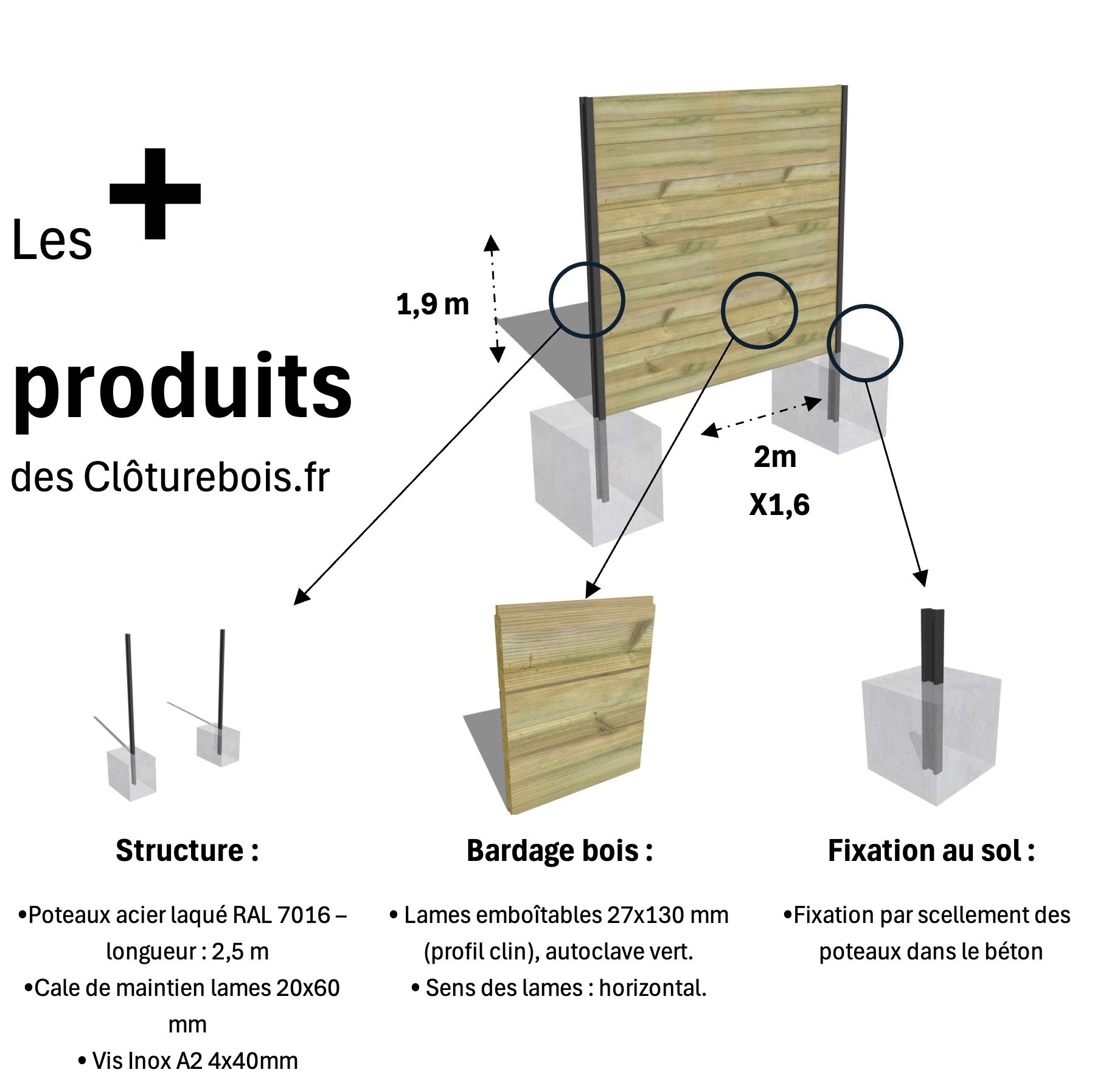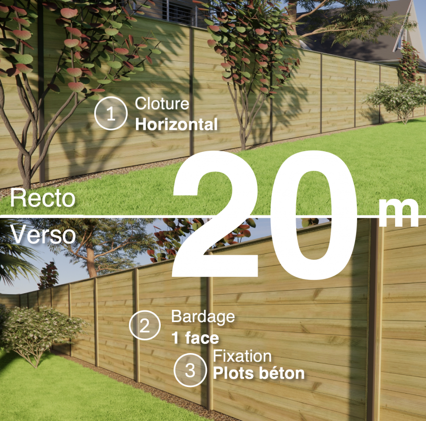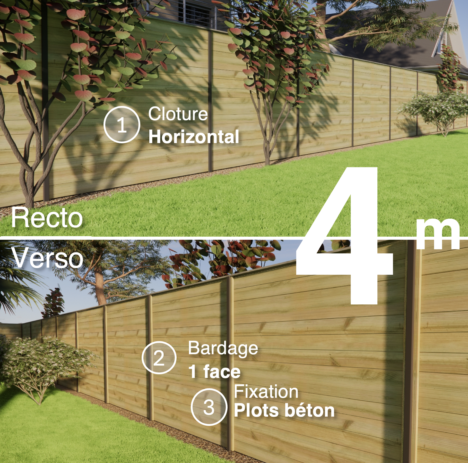 En fonction du modèle sélectionné, vous pouvez personnaliser votre clôture : hauteur, sens du bardage (horizontal ou vertical), espacement entre les lames, recto/verso, options de finition et isolation phonique.